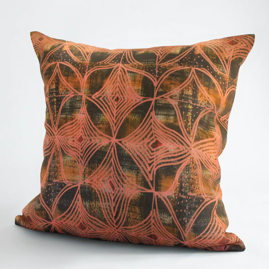 MACHAKOS decorative pillows display exquisite hand-painted artwork. The abstract design features rich tonal colors and patterns derived from an African masquerade. Each pillow comes with a concealed zipper and a 10% goose down and 90% goose feather insert made in the USA.