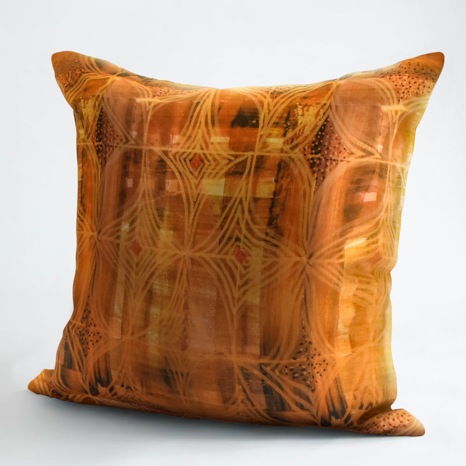 MACHAKOS decorative pillows display exquisite hand-painted artwork. The abstract design features rich tonal colors and patterns derived from an African masquerade. Each pillow comes with a concealed zipper and a 10% goose down and 90% goose feather insert made in the USA.