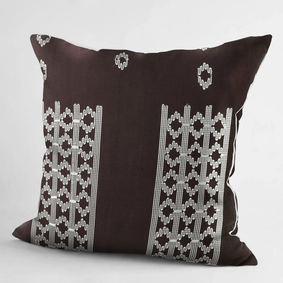 EDO collection are exceptional handwoven limited edition Nigerian Aso-oke pillows featuring classic motifs. Muted in a rich chocolate brown with white embroidery, this decorative pillow will add a touch of sophistication to your home decor. Each pillow comes with a premium 10% down and 90% feather insert made in the USA.
