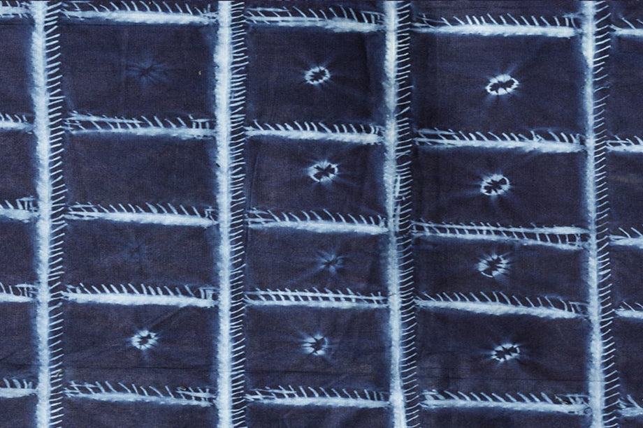 Stitched with raffia. Hand painted and resist dyed in Natural Indigo