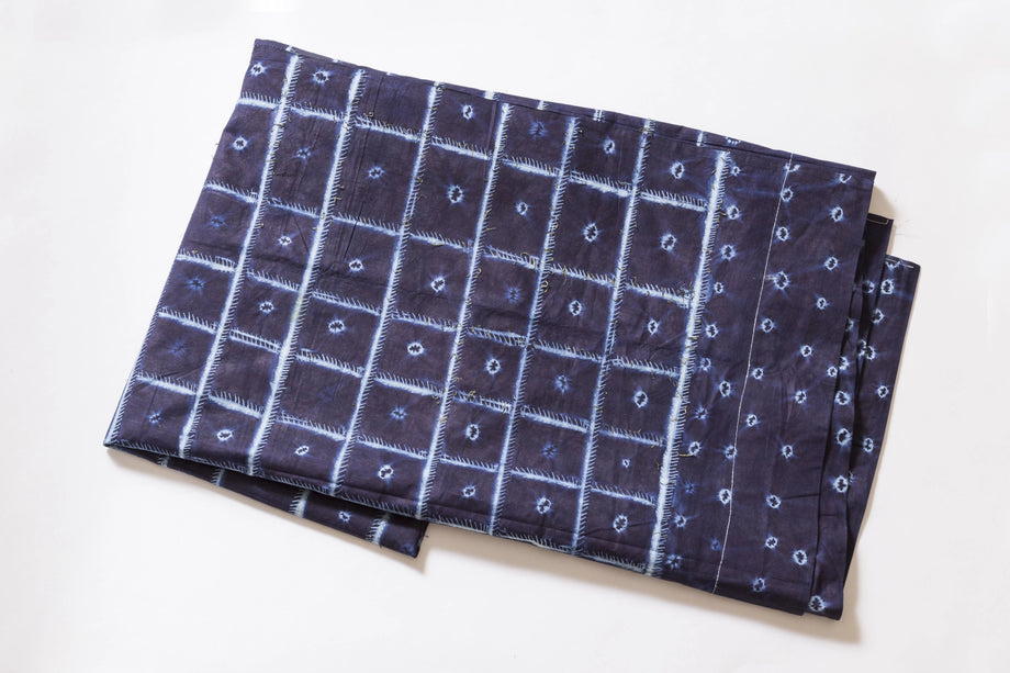 Adire Eleko is a style of Nigerian indigo textiles that is painstakingly hand painted complex symbolic designs. They are made with resistance-dye techniques, using the finished hand-painted cotton cloth that is dipped in natural indigo dyes. This beautiful piece highlights a detailed design and the rich indigo color found in older textiles but rarely replicated today.