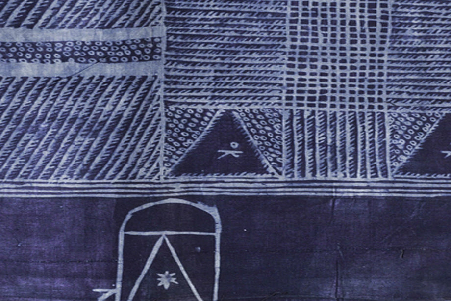 Adire Eleko is a style of Nigerian indigo textiles crafted with complex designs of symbolic patterns. It is made with resistance-dye techniques using hand-painted cotton cloth then dipped in natural indigo dyes. The detail in the designs and the richness of the indigo in older textiles is rarely found in modern designs. Highlighted by an iconic signature of the artisan.